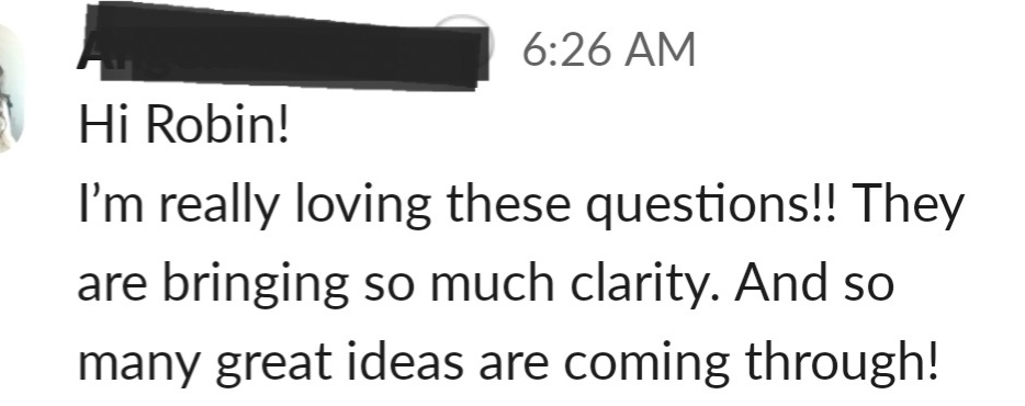 "As I worked throughout the homework, I'm already having some new ideas pop up, thatI'm excited to explore deeper. I love the content, delivery and energy!"