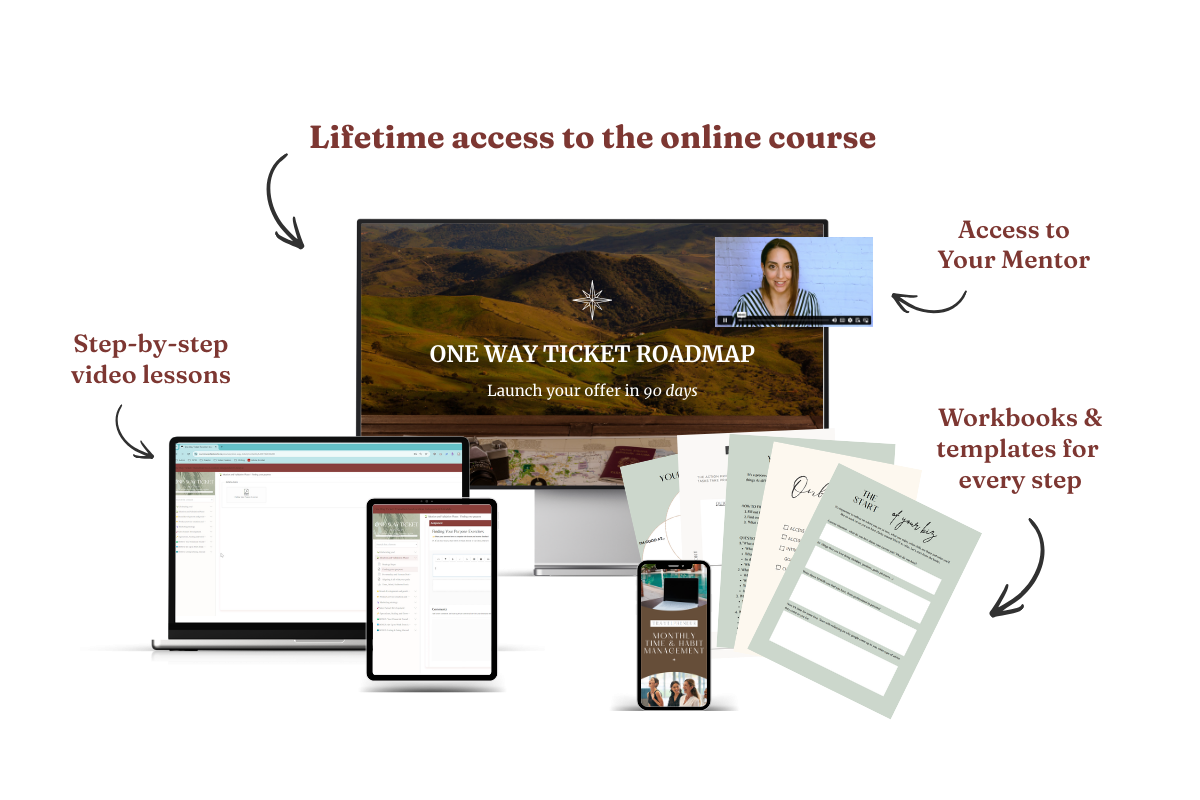 Good news: the course won’t disappear into some dusty portal. One Way Ticket is built to keep you moving. It’s designed as a 3-month launch support plan, but life happens, and every student does have 12 months of access to the curriculum to help you finish what you start. If you need more time? Our goal is you’re selling by month four, not still tinkering months and months.